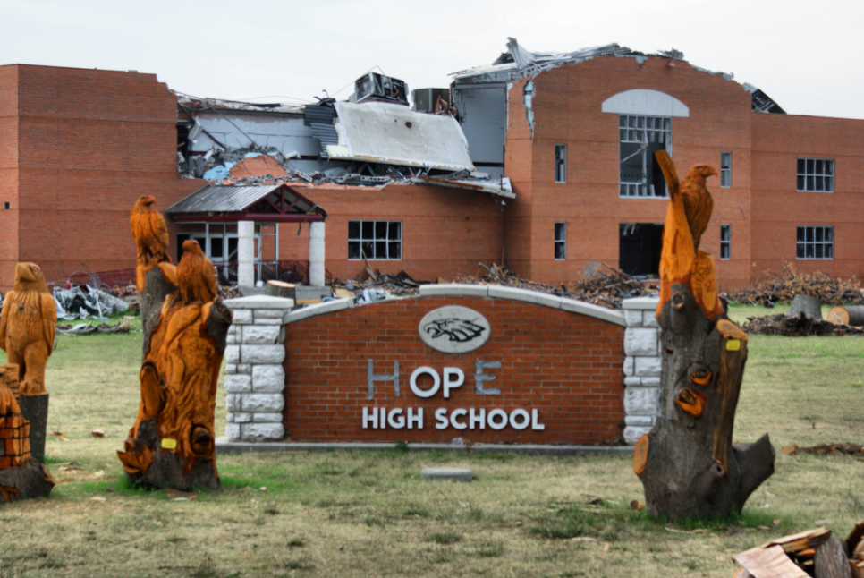 There are Eagle sculptures out front, carved from the remains of shredded trees. The rubble sits behind, one of the biggest high schools in the state laying in ruins.