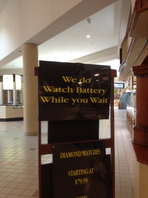 Forget about the mangled grammar. Think about the content of the message. We will change your watch battery while you wait. Um, how is that worthy of advertisement? You can wait while someone does anything, or while someone does nothing. In fact, waiting is what you ALWAYS do when someone else takes time to do something for you.